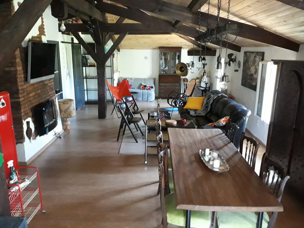 Großer Wohnbereich mit Essplatz und Couch, Fernseher und Arbeitsplatz. Klimagerät und elektr. Kamin.