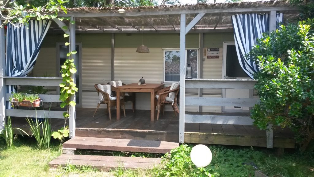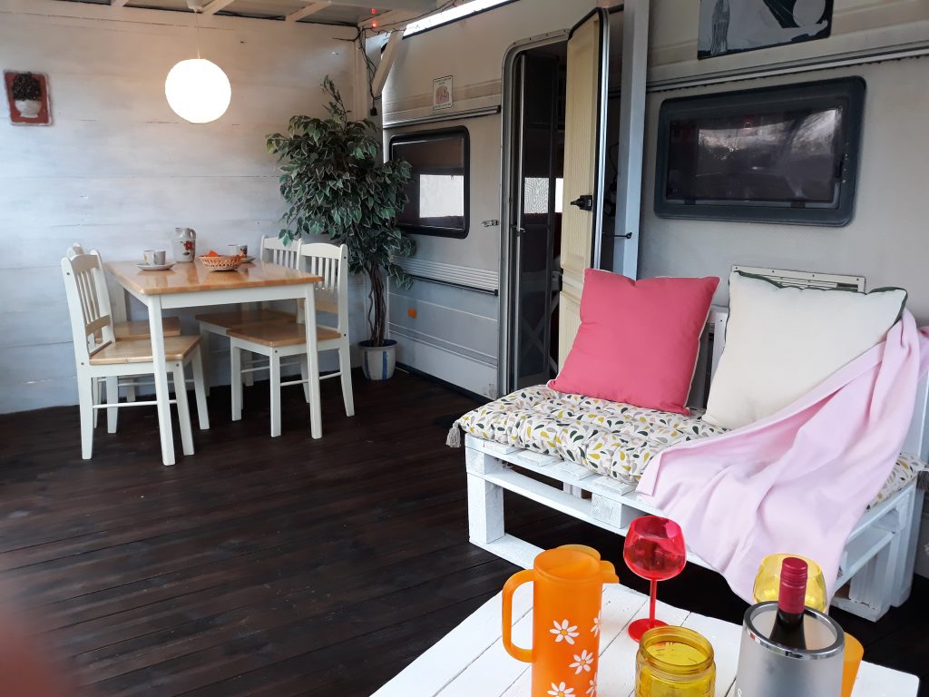 Überdachte Terrasse mit Essplatz und Sitzecke mit Palettenmöbeln, eigener nicht eingezäunter kleiner privater Garten mit Gartenmöbeln/Liegen