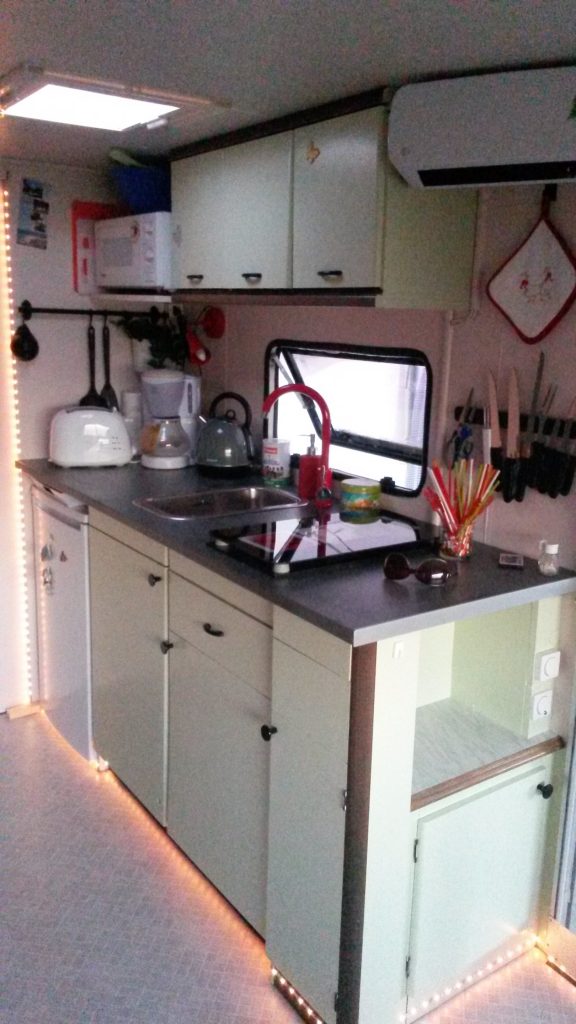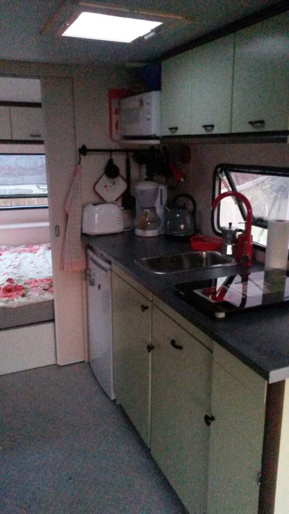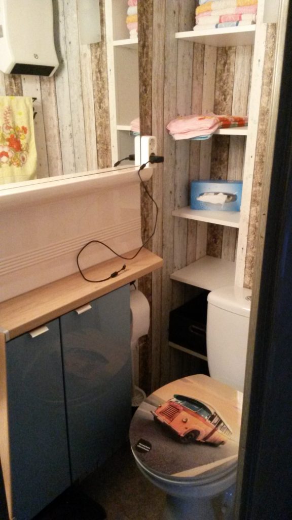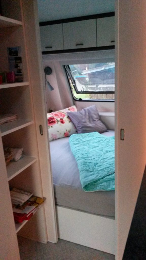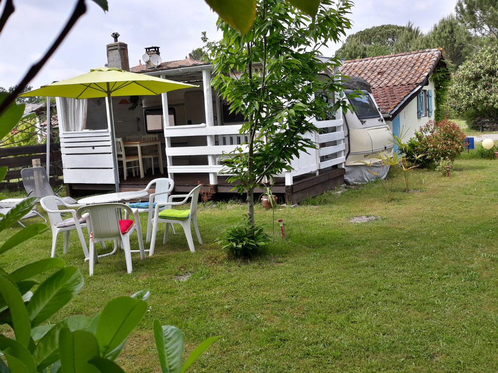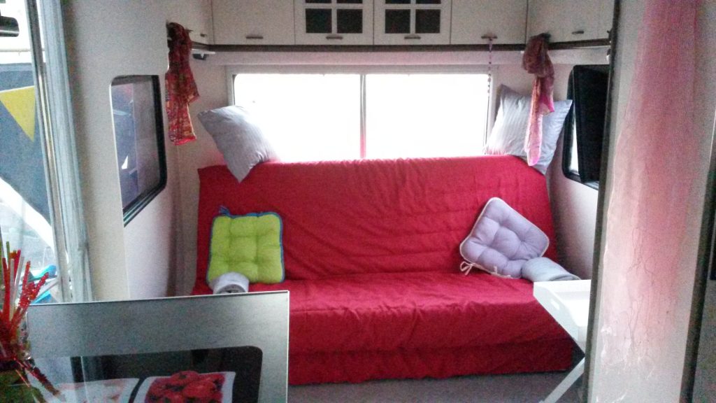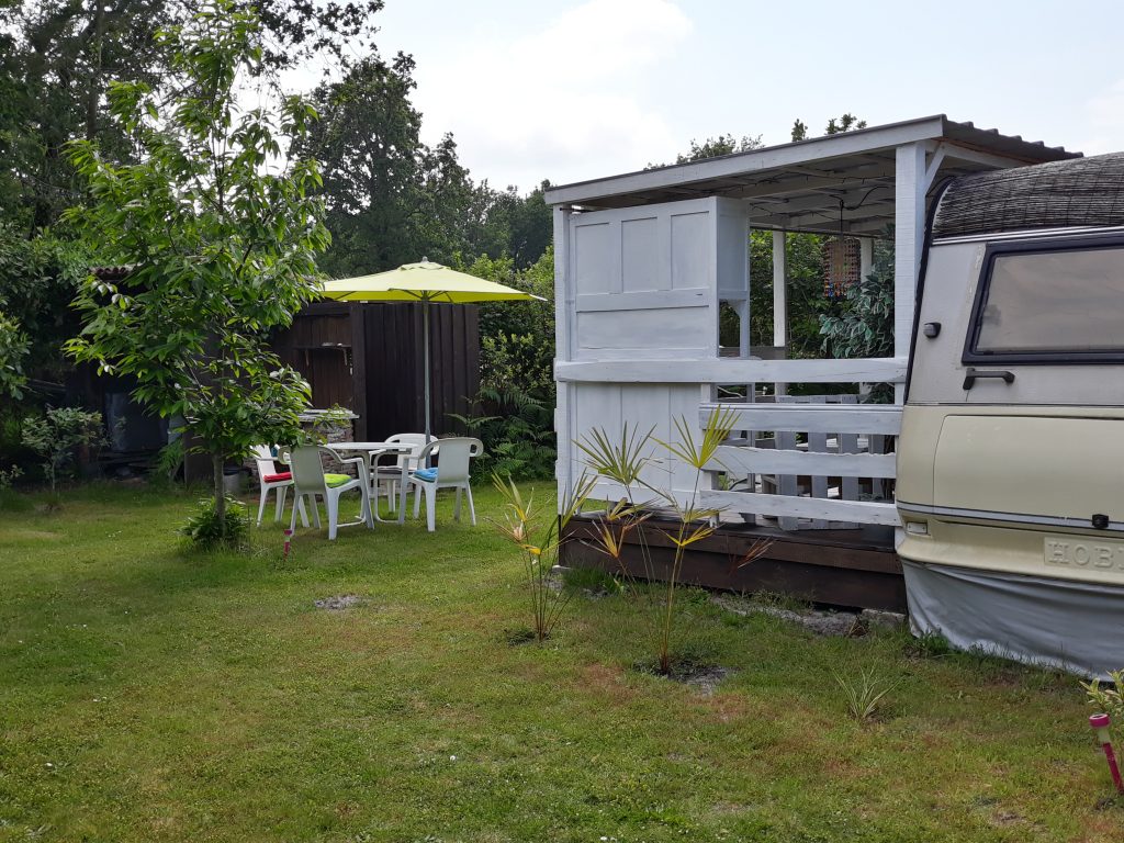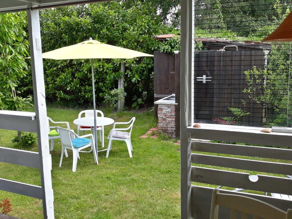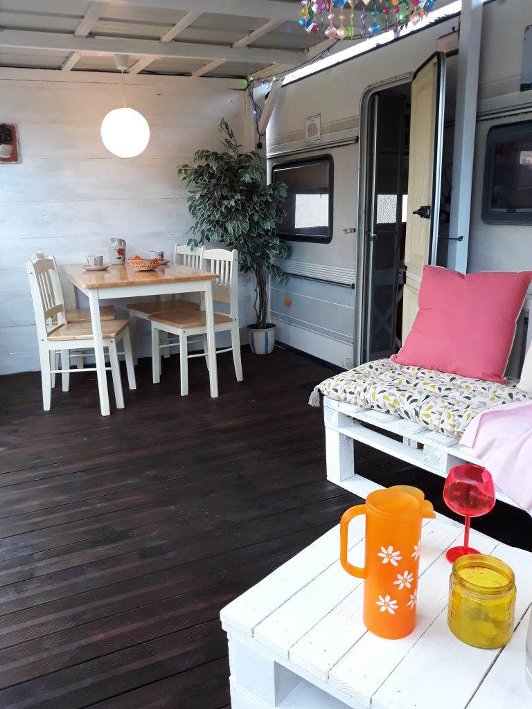 Viel Komfort auf kleinem Raum mit einer großen überdachten Terrasse. Es gibt ein Schlafzimmer mit Doppelbett 1,40 x 2,00 (weiche Matratze) und Schiebetür sowie eine ausgestattete Küche. Der Wohnbereich hat eine Couch zum Ausklappen (als Schlafgelegenheit 1,30 x 1,90 für mind. eine weitere Person). Weiterhin gibt es ein kleines Bad mit "echtem" WC, aber die Dusche mit Warmwasser ist außen. Ein zusätzliches Abwaschbecken befindet sich neben der Dusche.